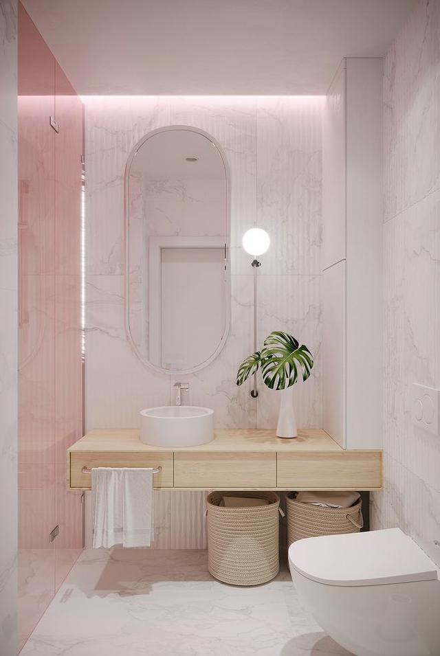 近幾年流行在衛(wèi)生間挖壁龕來實現(xiàn)收納的需求,而上面的案例設(shè)計就融合了壁龕元素,而底部也額外增加了一層收納空間,利用收納筐來擺放洗漱用品,整體內(nèi)嵌式的布局設(shè)計也使得空間顯得更整潔。