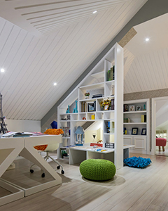 在書房里,設(shè)計師將陳列架巧妙地分隔成一個個格子,美觀收納兩齊全。條形對稱的陳列架設(shè)計,增加空間對稱美的同時還延伸了空間視覺效果。白色作為主色調(diào),不僅簡潔大方,還有利于提亮空間。